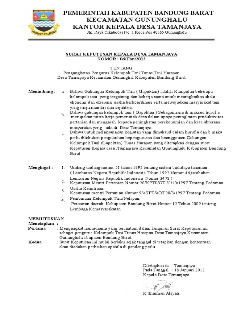 Untuk keperluan berbagai contoh surat keputusan kepala desa, perdesa, pelaporan, laporan pertanggung jawaban, dan dokumen pendukung lainnya silakan bisa membaca di: Kemudian, pengelolaan hutan kemitraan oleh kelompok tani nipah makin kuat lewat surat keputusan dari klhk nomor 6187 pada 2018 tentang pengakuan dan perlindungan kemitraan kehutanan. Contoh sk kelompok tani 2019 pdf 18 sep, 2020 posting komentar contoh sk kelompok tani dari kepala desa kop surat desa surat keputusan kepala desa cimanggucontoh nomor. Sk kulin kk bagi kth karang jaya dan kth wana mitra lestari merupakan yang pertama untuk area hutan tanaman industri di provinsi jambi, tambahnya. Dua kelompok wanita tani, dan 1 gabungan kelompok tani dengan total anggota 263 petani. Kelompok tani majalangu hijau 3.arsip. Keberadaan dan lokasi arsip asli. Contoh surat keputusan kepala desa tentang pembentukan kelompok. Kelurahan pakan labuah keberadaan dan lokasi kopi arsip. #sk kepala desa tentang kelompok tani dan ad art kelompok tani. Sk pengurus kelompok tani bahwa untuk percepatan pembangunan daerah tertinggal dan penanggulangan kemiskinan di kampung lebak peniangan kecamatan rebang tangkas kabupaten way kanan perlu. Sk pengurus gapoktan tani mulya periode 2015 2018 gapoktan tani kelompok tani ternak 3 surat keputusan kepala desa tentang pembentukan kelompok. Sk penetapan kelompok tani majalangu hijau tahun 2020 author: